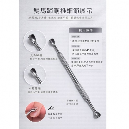 專為美甲師與居家保養需求打造。採用高硬度不鏽鋼材質,一體成型更耐用,不易生鏽、不易變形。雙頭設計搭配馬蹄形推棒與超薄鋼推,能輕鬆整理死皮、角質與指緣倒刺,快速打造乾淨平整甲面,讓後續上色、凝膠施作更服貼。